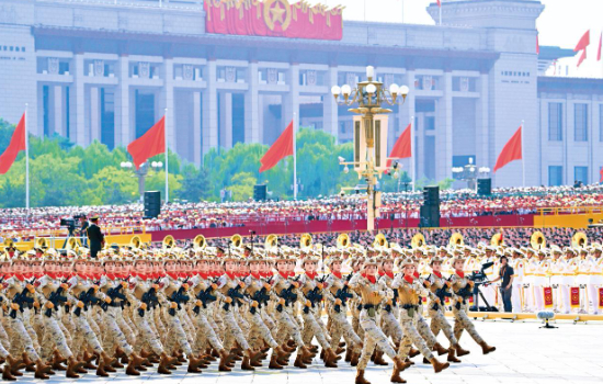 △2025年9月3日,纪念中国人民抗日战争暨世界反法西斯战争胜利80周年大会上,全部由女民兵组成的民兵方队阔步走过天安门广场。