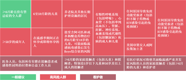 所有人。所有≥6 月龄且没有禁忌症的人应每年常规接种流感疫苗,尤其是对于患有严重疾病和流感并发症风险增加的人(详见下图),以及可能接触流感患者的医护人员。