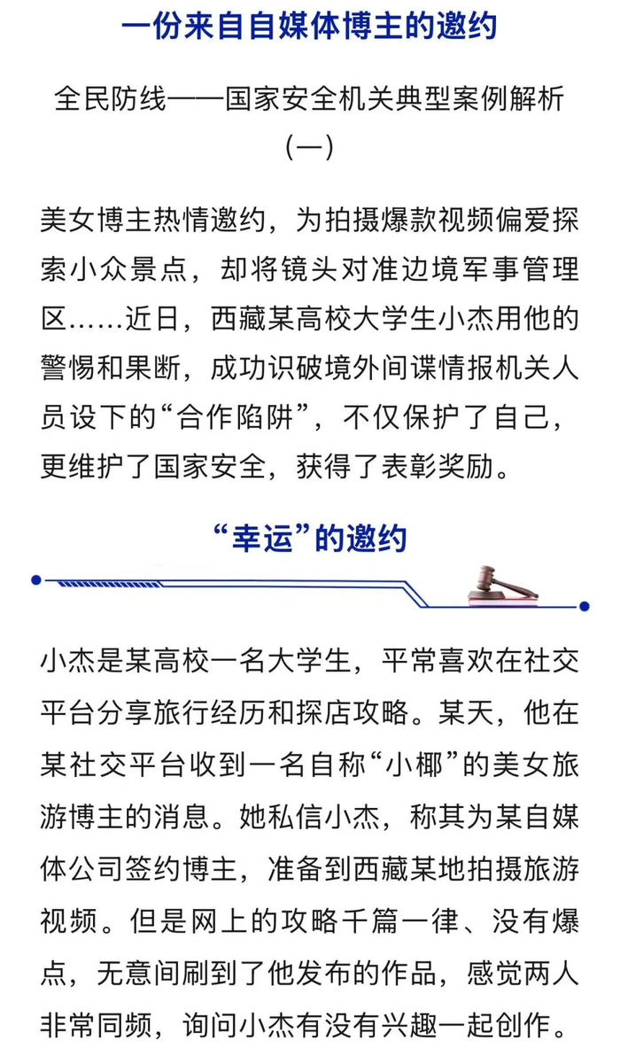 近年来,境外间谍情报机关不断加强对我境内渗透拉拢,他们不仅聚焦我关键群体、核心领域,更逐渐将目光广泛投向我普通民众。他们假借交流调研、咨询服务、项目合作等名义,主动贴靠、攀拉利诱我境内人员对我高价值战略目标等开展情报窃密活动,以“小举动”危害我“大安全”,以“小投入”窃取我“大秘密”。此类案件发生率正呈上升趋势,对我国家安全造成威胁。从今天起,国家安全部官方微信公众号特推出“全民防线——国家安全机关典型案例解析”专题,提高全民意识,发动全民力量,压缩“网勾”“观搜”等危安行为生存空间,进一步筑牢反间防谍人民防线。