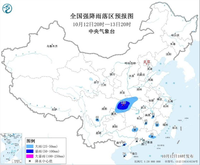 央视网消息:中央气象台10月12日18时继续发布暴雨蓝色预警,预计,10月12日20时至13日20时,陕西东南部、四川东北部、重庆中北部、湖北西部、河南西南部等地的部分地区有大到暴雨,其中,重庆北部等地局地大暴雨(100~120毫米)。另外,广东东部和西南部、广西南部、海南岛西部、湖南南部、江西南部和东部、福建西部等地局地有大雨或暴雨(50~80毫米),上述部分地区伴有短时强降水(最大小时降雨量20~40毫米,局地可超过50毫米),局地有雷暴大风等强对流天气。