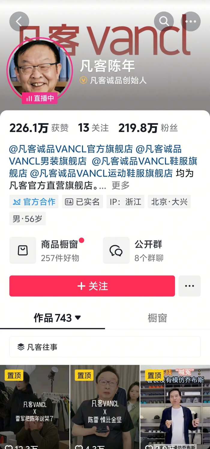 雷军在2025年年度演讲中提及此事,感慨 “55 岁正是闯的年纪”,如今陈年带领团队深耕直播,并拿下抖音男装类目第一的成绩,这让他由衷佩服。