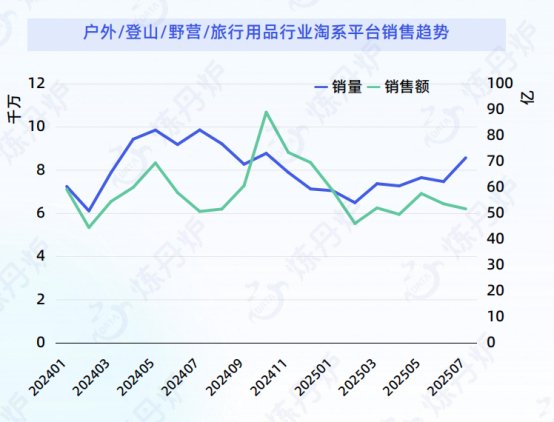 “泛户外”趋势明显,露营装备日常化。2025年“山系穿搭”带动户外服饰市场破1430亿元;2025年1-7月淘系“户外/登山/野营/旅行用品”销售额增25%,“城市露营”产品销量占超60%。