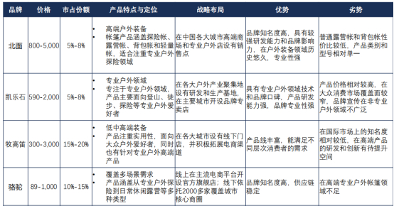露营市场竞争呈现“国际品牌高端化、国产品牌大众化”特点。北面与凯乐石市占率5%-8%,主打专业领域,价格590-5000元;牧高笛以15%-20%市占率居大众市场首位,300-3000元产品线覆盖多元需求。