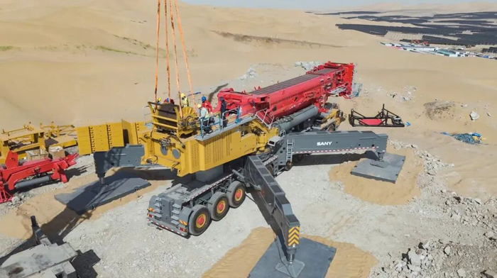 SAC30000T的部件被二十多台重型卡车运抵现场时,在苍茫的沙海中,像一艘即将组装的星际战舰的零件。脚下尽是松软的沙地,头顶是变幻莫测的天空,在沙漠里组装这么一个庞然大物,本身就是一门学问。