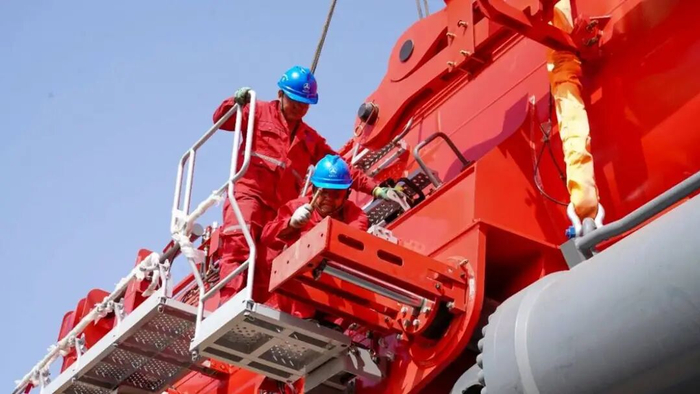 此次吊装的单机容量10兆瓦风机,轮毂中心高度130米,机舱重量187.6吨,含吊具总重205吨。青岛君盛操作手刘彬师傅介绍说:这是力量与精度之间的连接,它要做的,不是简单的吊起来,而是在百米高空,完成一次‘穿针引线’——将机舱底部密密麻麻的螺栓孔,与塔筒顶端同样密集的螺栓进行精准对位,这需要的不只是配合,更是对经验和车辆的操控性能的考验