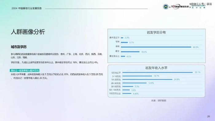 相比不错的健身、解压、出片效果,综合成年岩友的消费能力,攀岩的成本并不算高。在杭州,不少岩馆的单日/次费用在100元以内。与之相对应的是,《报告》显示,成年岩友26-30岁人群占比*,九成以上学历在本科以上,超一半年收入在10万元以上。