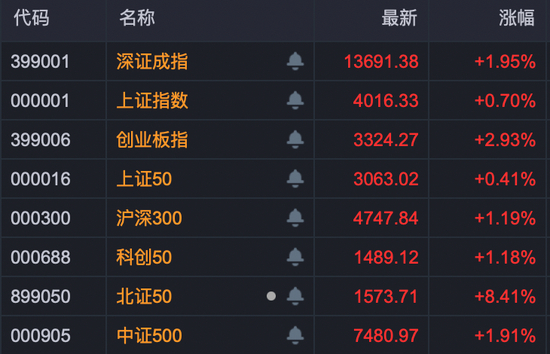 今日,A股强势上攻,上证指数再创10年新高,站稳4000点。北证50放量飙升8.41%,创近半年最大单日涨幅。创业板指也大涨近3%,近4年来首次收在3300点之上。市场成交温和放大至2.29万亿元。