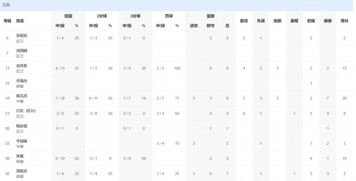 江苏队方面,蒋浩然20分6篮板2助攻2抢断,孙鑫15分2篮板。