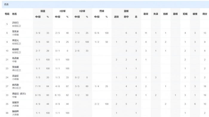 中国香港队方面,惠龙儿19分8篮板1助攻,蔡再懃18分4篮板2助攻。
