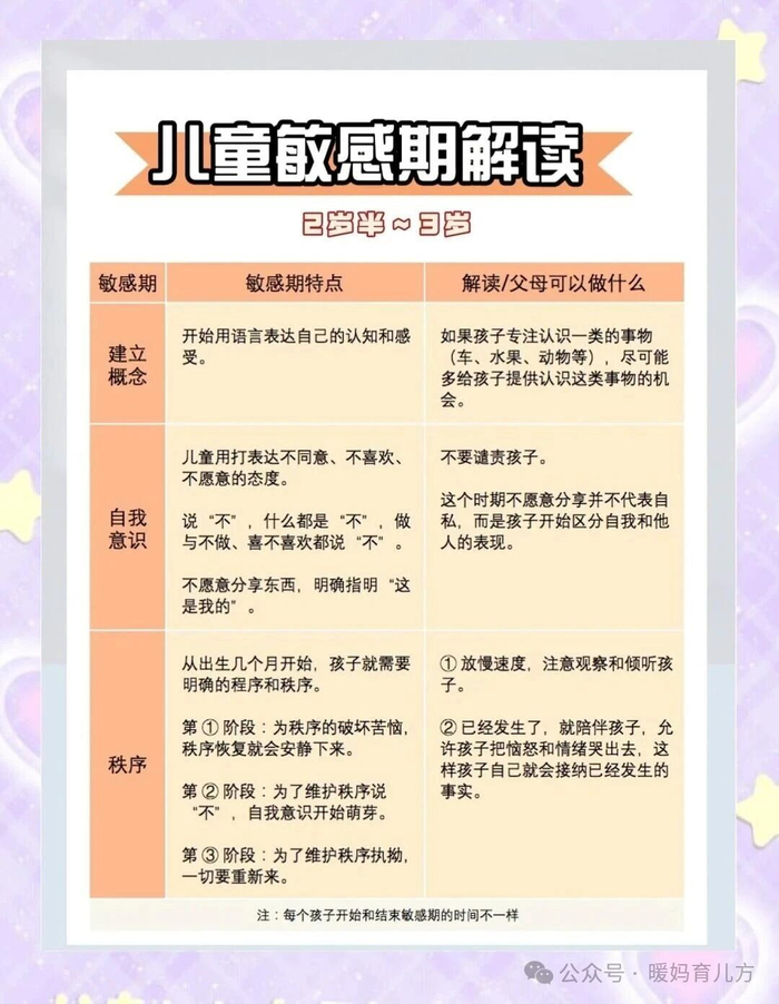 另外,孩子们在这个阶段也会表现出对秩序的敏感。如果秩序被打破,他们会感到混乱和不安。其实,孩子们对秩序的需求从几个月大的时候就开始了,只是最初几个月时,只要恢复秩序,孩子就会安静下来。到了2岁多,孩子们会为了维护秩序而说“不”,执拗地要求一切要重新来。