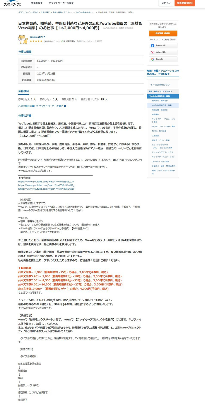 据报道,“云工作”上的招聘信息写到:“正在招聘YouTube视频的剧本写手,视频内容包括‘称赞日本人、抹黑中国人’等,每段视频的薪酬为2000日元到4000日元不等。”招聘信息还声称,“抹黑中国人形象的视频剧本可以是虚构的。剧本可以是基于其他现有视频,但要有足够修改让人感觉是全新的视频。”