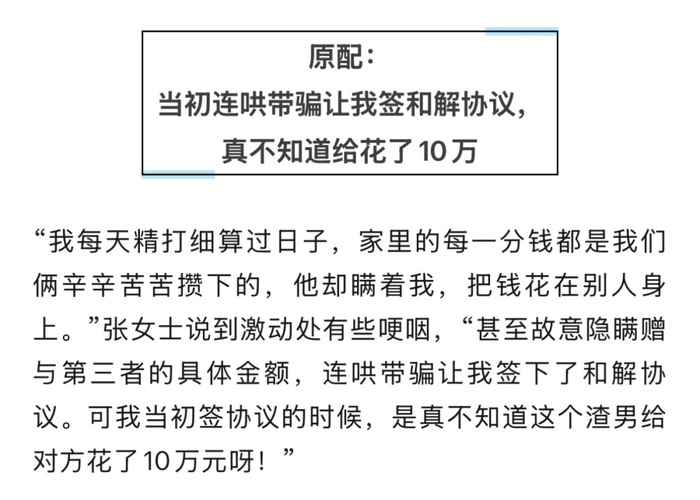 “这一年时间,我丈夫给她花的钱有10万元,他们当初骗我,让我草草签了和解协议。”张女士越想越来气。