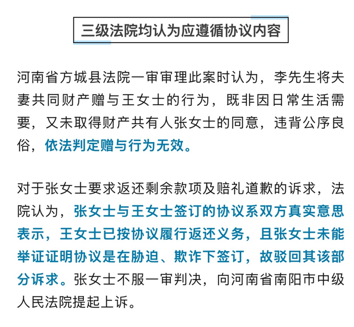约10万元夫妻共同财产被丈夫偷偷赠与第三者,原配张女士费尽周折只追回5.1万元。这一切的根源,是原配还未查清楚丈夫给第三者转了多少钱,就草草和第三者签了和解协议,并注明“双方达成一致,以后不再联系、互不相欠、互不追究。”