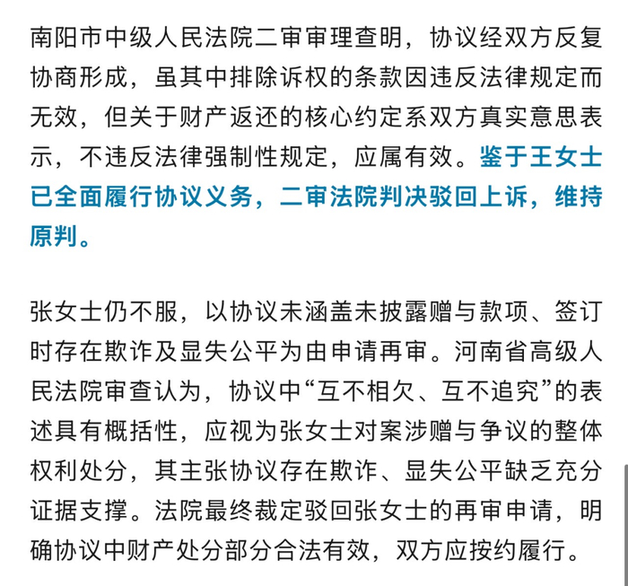 记者注意到,这份2024年11月15日签署的协议仅有张女士签名及身份证号,结尾写明:“不再对王女士起诉,至此以后,张女士就不再追究王女士插足婚姻的事。双方达成一致,以后不再联系、互不相欠、互不追究。”