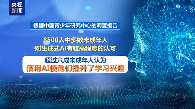 根据中国青少年研究中心的调查报告,8500人中多数未成年人对生成式AI有较高程度的认可,超过六成未成年人认为使用AI使他们提升了学习兴趣。