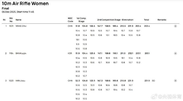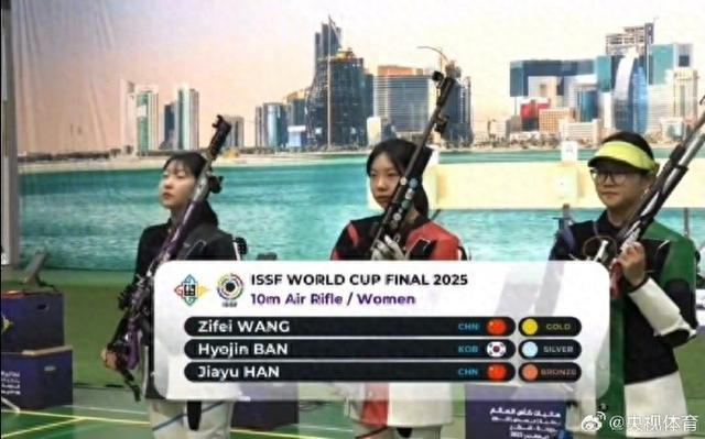 2025射击世界杯总决赛女子10米气步枪决赛,三位中国选手黄雨婷、韩佳予、王子菲闯进决赛。最终,王子菲夺得冠军,韩佳予收获季军,黄雨婷位列第五名。