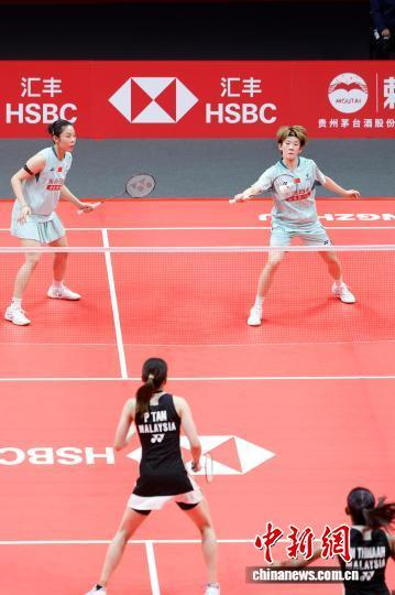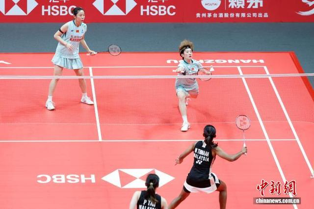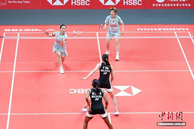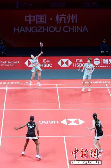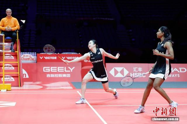 12月17日,2025年世界羽联世界巡回赛总决赛在浙江杭州举行。在首日进行的女双小组赛A组比赛中,马来西亚组合陈康乐/蒂娜2比0战胜中国组合贾一凡/张殊贤。图为马来西亚组合在比赛中。中新社记者 肖健 摄