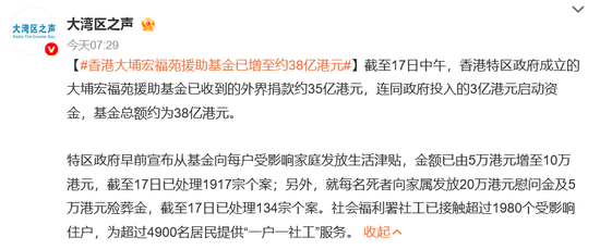 截至17日中午,香港特区政府成立的大埔宏福苑援助基金已收到的外界捐款约35亿港元,连同政府投入的3亿港元启动资金,基金总额约为38亿港元。