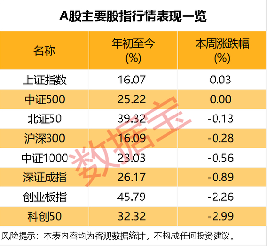 本周(12月15日至19日),A股市场涨跌互现,成交规模维持在1.6万亿元上方。指数方面,上证指数一周小幅上涨0.03%,深证成指下跌0.89%,创业板指下跌2.26%,科创50指数跌幅最高,为2.99%。