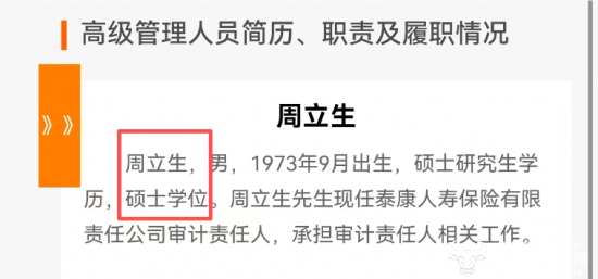 从西南财经大学毕业的金融高管还是非常多的。除了周立生还有中华财险的总经理蒋新伟、大家财险的总经理梁鑫杰、申能财险的总经理盛亚峰等。不过在泰康人寿官网上,周立生的任职信息中,却仅有硕士研究生学历,硕士学位,不知是怎么回事。