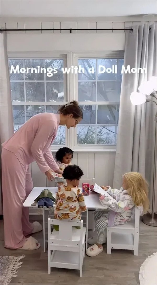 除此之外,吉娜还会和这些娃娃在一起吃东西、一起庆祝节日、外出体验超市购物、花园野餐,有时还会在家进行学校角色扮演,以及孩子生病就医的戏码。