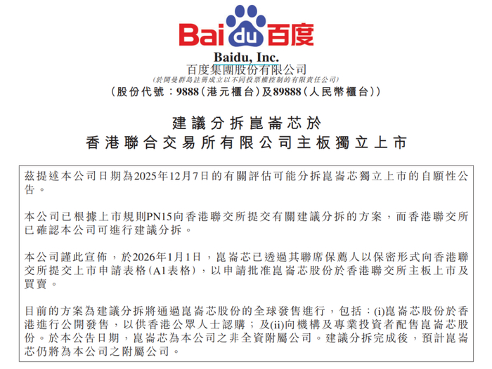 百度集团称,目前的方案为建议分拆将通过昆仑芯股份的全球发售进行,包括:昆仑芯股份于香港进行公开发售,以供香港公众人士认购;向机构及专业投资者配售昆仑芯股份。建议分拆完成后,预计昆仑芯仍将为百度集团的附属公司。