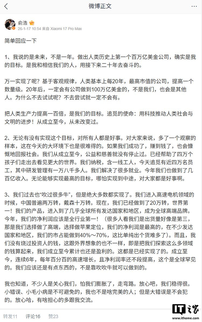 IT之家 1 月 17 日消息,追觅科技创始人兼 CEO 俞浩今日在微博发文,对近期关于“打造百万亿美元公司”的言论进行了公开回应。