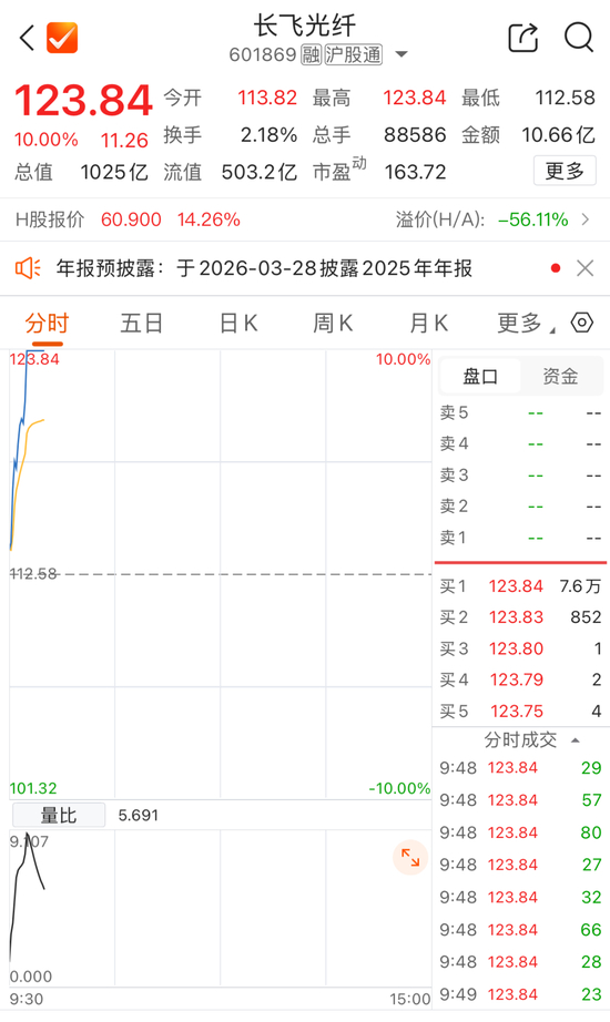26日早盘,长飞光纤(601869)快速拉升涨停,报123.84元/股。