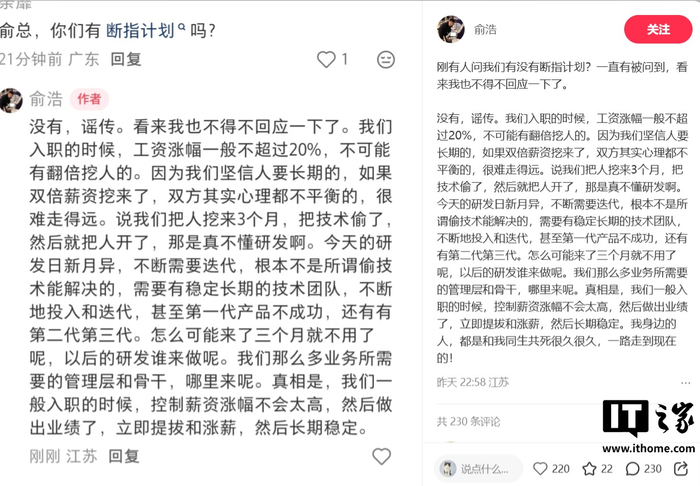 IT之家注意到,俞浩还在评论区回复了“之前网传你们员工猝死,然后只赔几万块的事情,是真的吗?”,表示:“假的。等我下次有力气的时候再写个完整经过来澄清一下吧。”