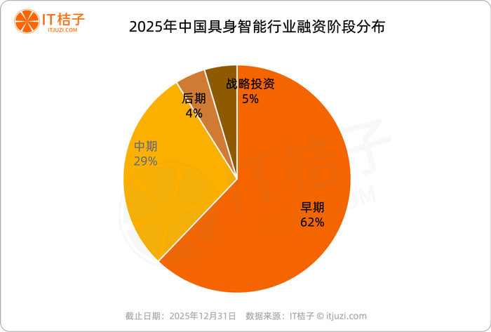 2025年,国内具身智能早期投资占比高达62%,是资金投入的最主要阶段,说明行业正处于技术验证与场景探索的早期,大量初创企业在资本支持下快速涌现。