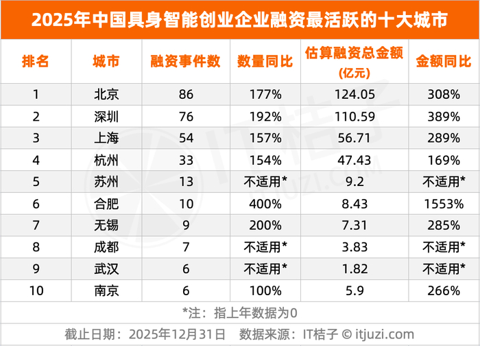 IT 桔子统计了2025年中国具身智能创业企业融资最活跃的十大城市,包括北京、深圳、上海、杭州等。