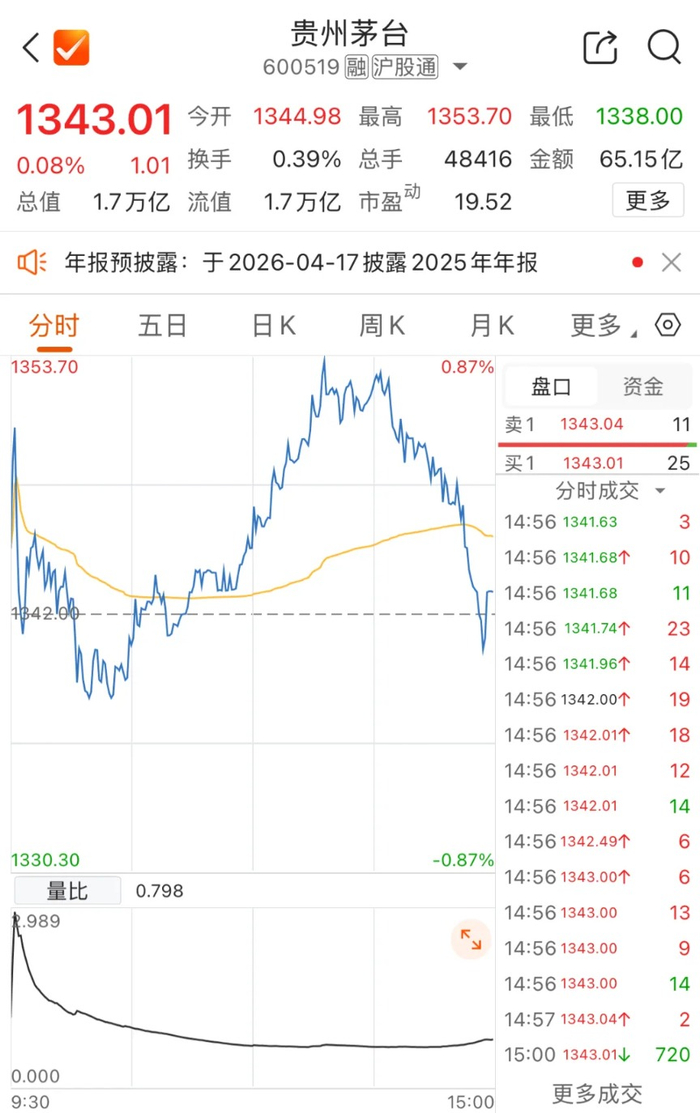 从贵州茅台最新股价来看,截至1月27日收盘,贵州茅台股价为1343.01元/股。