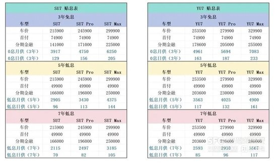“7年超低息,轻松入手特斯拉”“小鹏全系享7年低息,月供低至1355元”“购小米YU7 7年低息”……
