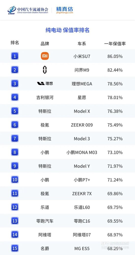 记者也注意到,推出“7年低息”贷款方案的车企,其主力车型保值率表现较高。据中国汽车流通协会最新发布的《2025年中国汽车保值率研究报告》,纯电动保值率排名前五的车为小米SU7、问界M9、理想MEGA、吉利银河(星愿)、特斯拉(Model X)。