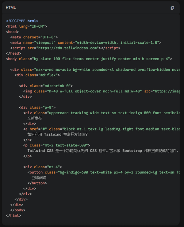 有 Tailwind 后,AI不需要理解设计意图,只需要像堆积木一样把这些“指令”堆在一起,页面就出来了。