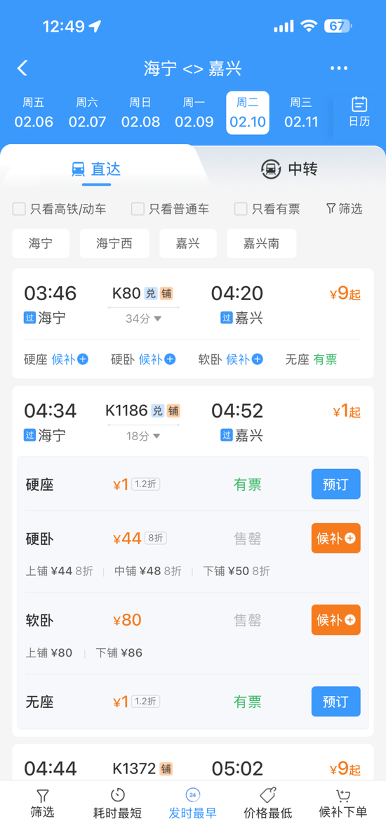 更短途的线路甚至出现1元特价票,如2月10日至11日,海宁至嘉兴的K1186次列车,享受1.2折优惠,票价仅1元。