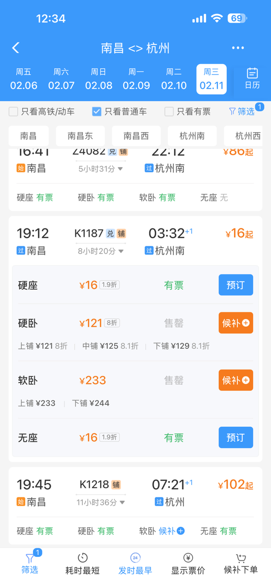 2月9日至11日,南昌至杭州南的K1187次列车,每日一班,硬座优惠价16元;