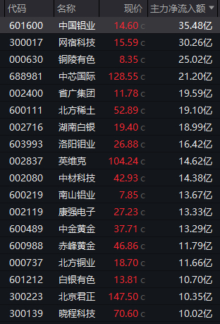 个股方面,中国铝业获得逾35亿元净流入,网宿科技获得逾30亿元净流入,铜陵有色、中芯国际均获得超20亿元净流入,省广集团、北方稀土等14股也获得超10亿元净流入。
