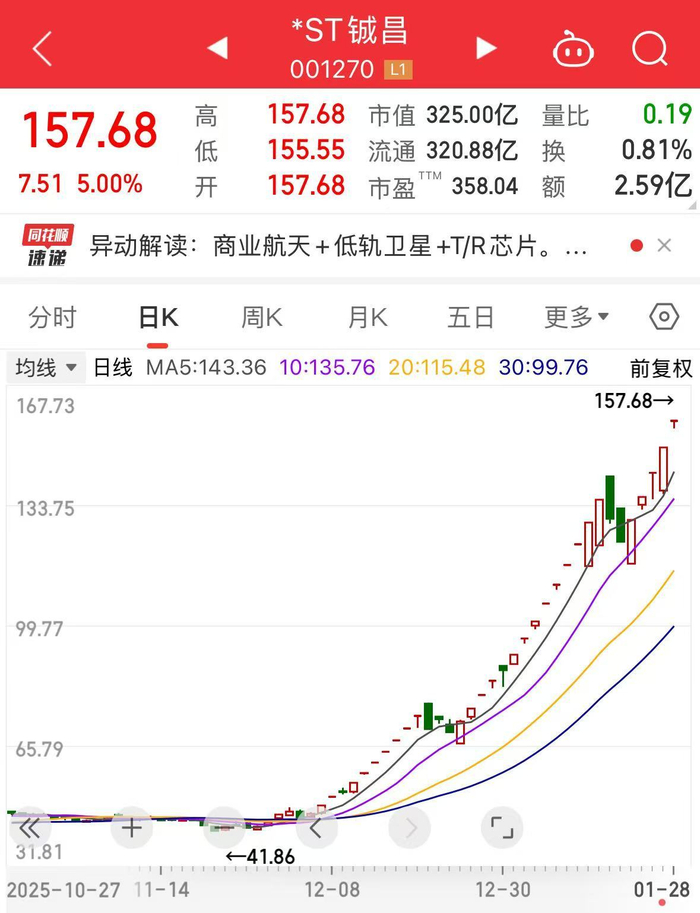 *ST铖昌股价自2025年12月1日以来大幅拉升,被市场称为近期商业航天板块大牛股。