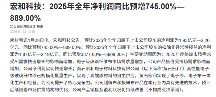 宏和科技:2025年净利同比预增745%-889%,电子级玻璃纤维布市场需求量增加