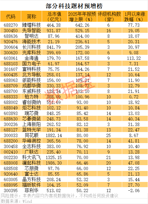 从预增幅度来看,臻镭科技居首,公司预计2025年年度归母净利润为1.23亿元到1.45亿元,同比增加529.64%到642.26%,主要系特种集成电路行业下游客户的产品需求有所增加,同时卫星通信领域市场拓展节奏稳步加快所致。