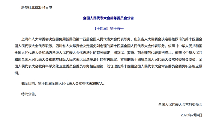 上海市人大常委会决定罢免周新民的第十四届全国人民代表大会代表职务山东省人大常委会决定罢免罗琦的第十四届全国人民代表大会代表职务。四川省人大常委会决定罢免刘仓理的第十四届全国人民代表大会代表职务。