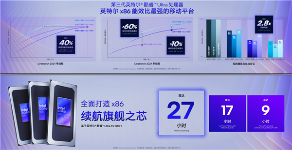 按照Intel官方的说法,基于旗舰型号酷睿Ultra X9 388H的笔记本,可以做到长达27小时的网络视频播放续航、17小时的办公续航、9小时的视频会议续航,出门在外根本不用充电器!