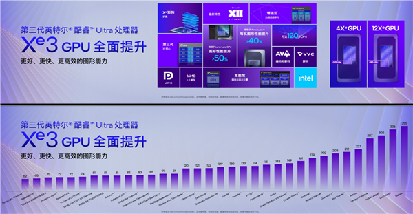 新的Xe3微架构,多达12个核心,增强型光追,16MB二级缓存,完整支持DX12 Ultimate。