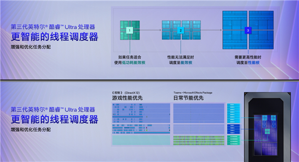 日常办公、娱乐等轻型工作负载可以完全只用LP E核,负载更高时才会去调用E核,而只有在游戏、视频剪辑、图形渲染等超高负载时才会启动P核,而且三种核心的配合也更加灵活高效。