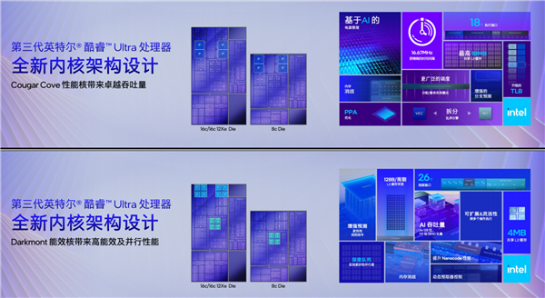 Panther Lake升级了全新的CPU架构,其中P核使用Cougar Core,E核和LP E核则是Darkmont,都显著提升了IPC性能和能效。