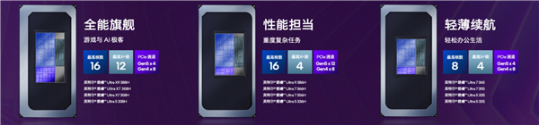 三是适合轻松办公生活的轻薄续航型,型号以5结尾,配备最多8核CPU、4核GPU、4条PCIe 5.0, 包括酷睿Ultra 7 365/355、酷睿Ultra 5 335/325。