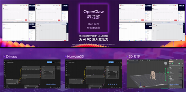 包括当下火爆的“养龙虾”,包括本地运行千问Qwen3.5-35B-A3B量化大模型(超过10 tokens/s)、Z-image文生图/混元3D建模/3D打印一条龙、樱桃智能语音助手、剪映(智能粗剪)、像素蛋糕(一键修图)、小云雀,等等。