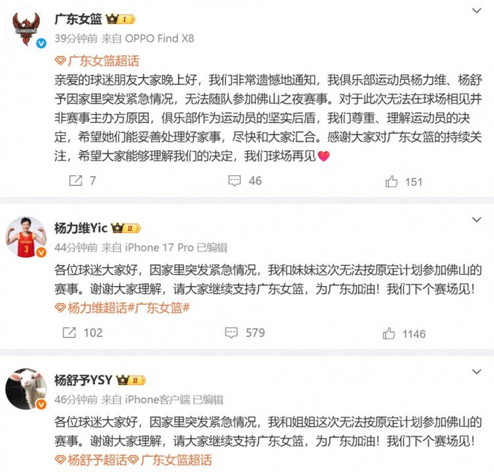 官方原文写道:“亲爱的球迷朋友大家晚上好,我们非常遗憾地通知,我俱乐部运动员杨力维、杨舒予因家里突发紧急情况,无法随队参加佛山之夜赛事。对于此次无法在球场相见并非赛事主办方原因,俱乐部作为运动员的坚实后盾,我们尊重、理解运动员的决定,希望她们能妥善处理好家事,尽快和大家汇合。感谢大家对广东女篮的持续关注,希望大家能够理解我们的决定,我们球场再见❤️”