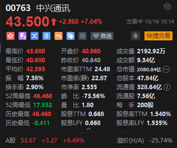 中兴通讯港股盘中涨超7%,成交逾9亿港元,本月累涨超22%。